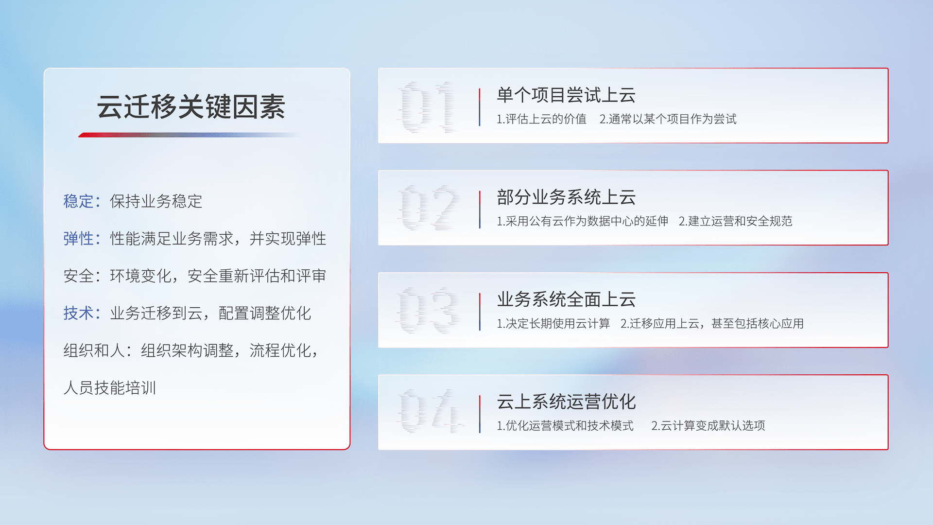 结合实际业务,,从规划设计、、云平台选型、、云原生改造、、、、数据迁移、、集成交付,,迁移全过程为客户识别最佳上云路径,,做好风险识别管理,,设计网络架构、、、、身份权限、、、安全审计合规、、操作审计、、、、日志审计、、、、监控告警策略、、、、多站点容灾设计等,,对云上基础设施进行整体规划,,,,提升IT治理水平,,以满足弹性、、、、高可用、、、高性能的需求。。。