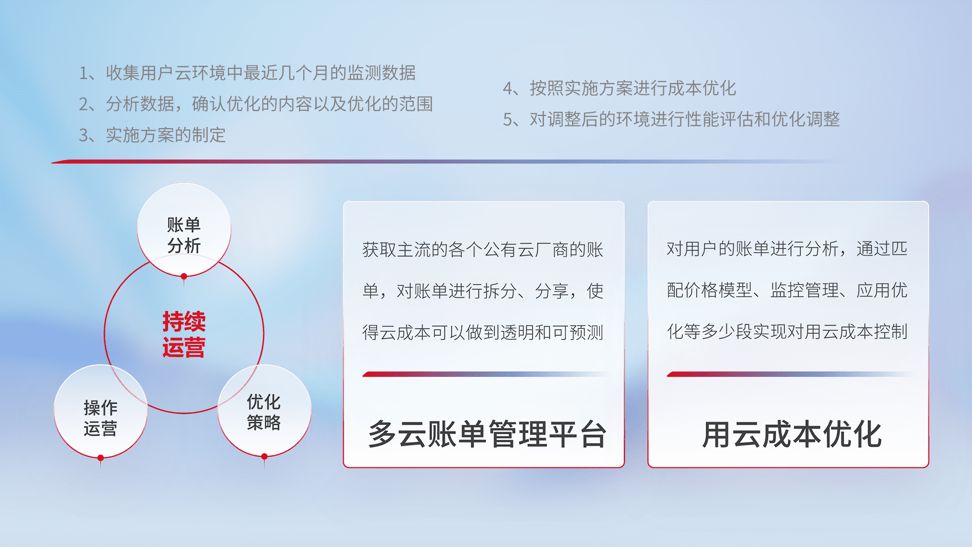通过多云纳管,,,以统一的资源数据模型把客户的云资源进行抽象和封装,,,进而实现对多云资源的统一操作,,保障云资源管理的可靠性、、稳定性与可用性。。量身定制化运维内容,,,,配置、、开发运维、、、补丁管理、、、备份、、、监控、、、认证和访问管理、、、审计和日常巡检等,,,保障在用云过程中的可靠度,,,稳定度以及高可用率。。